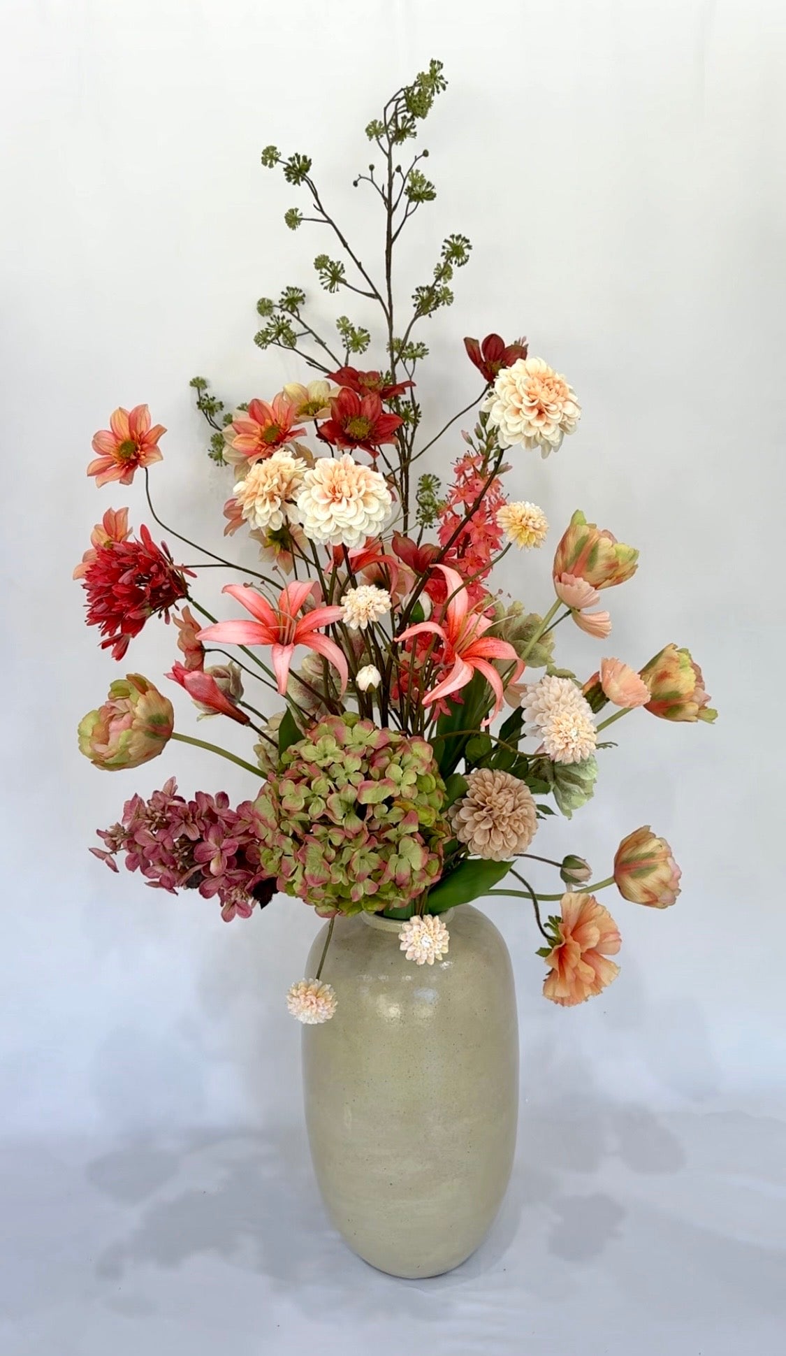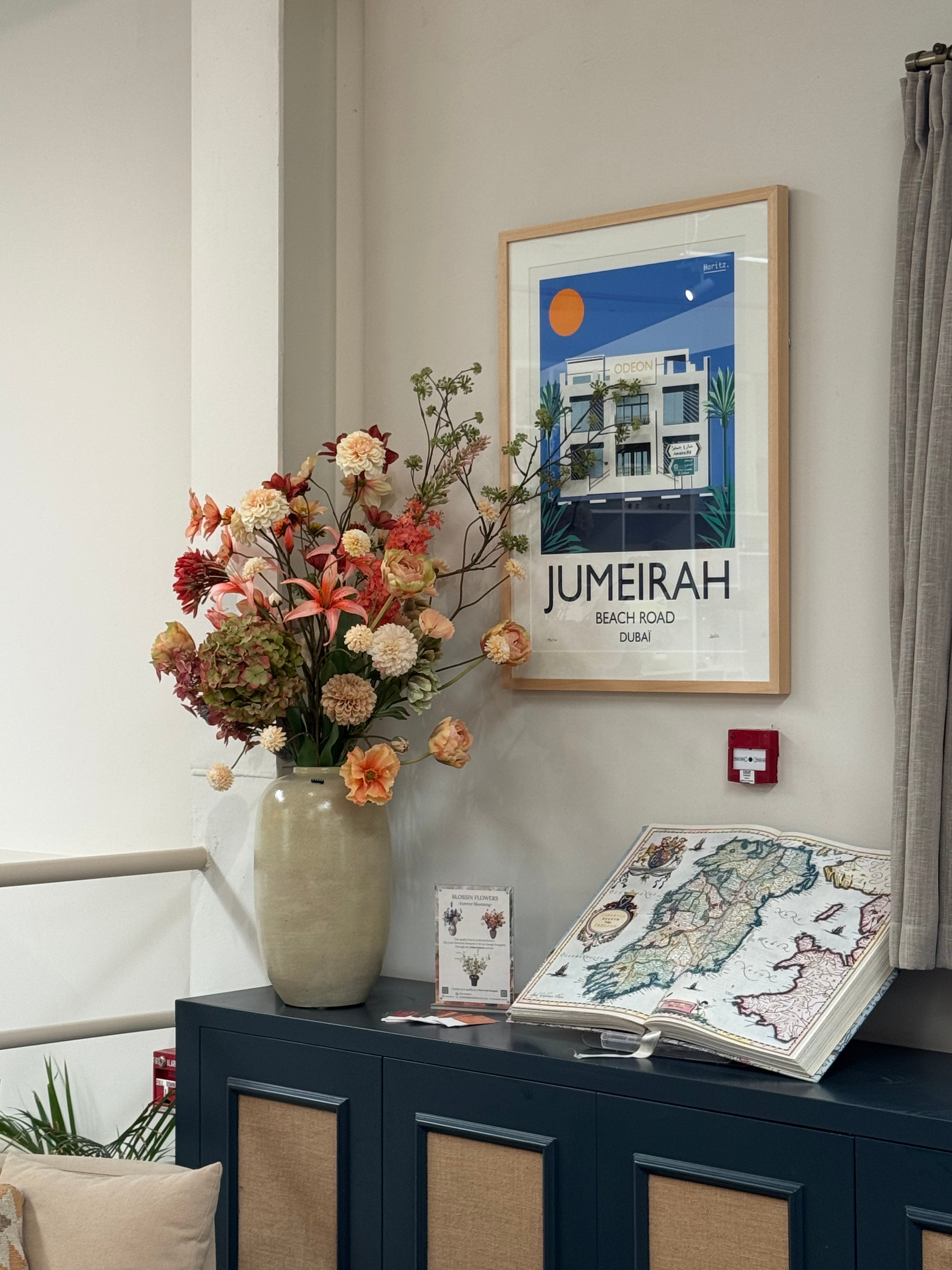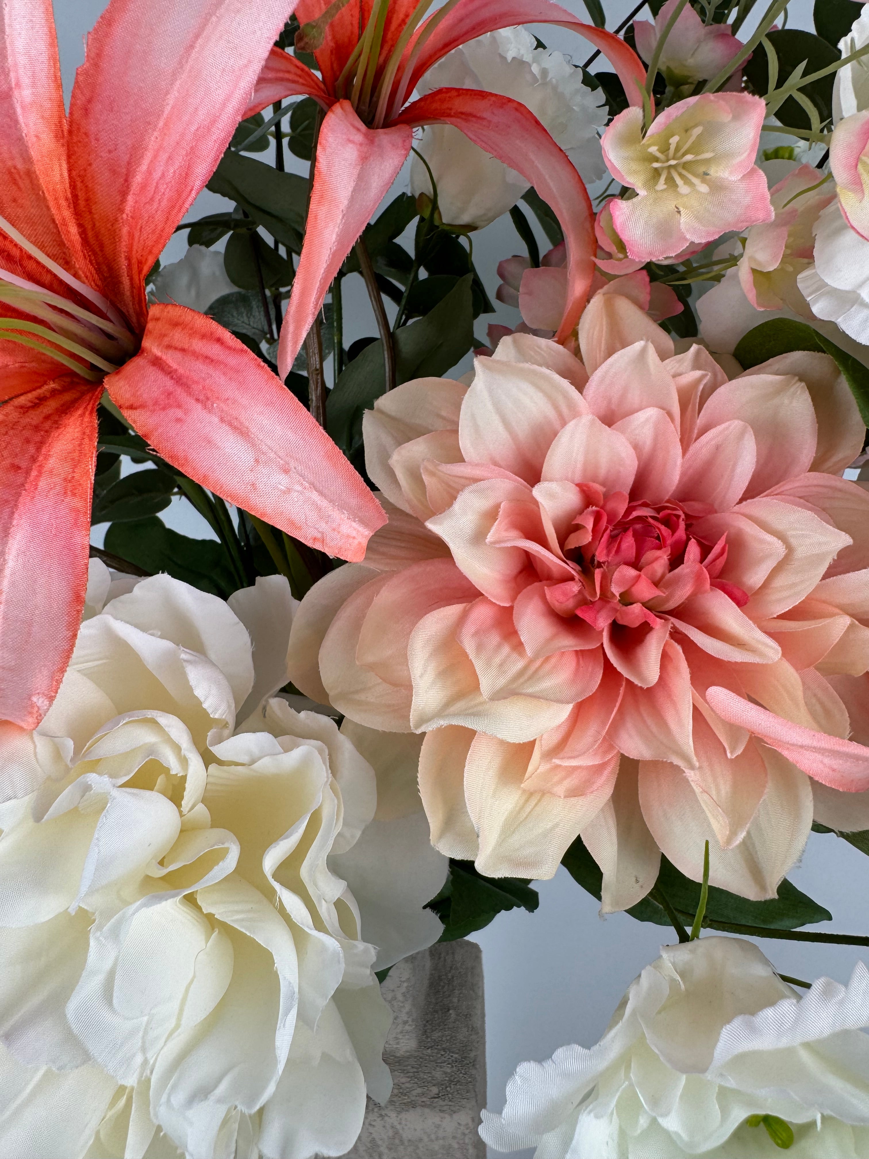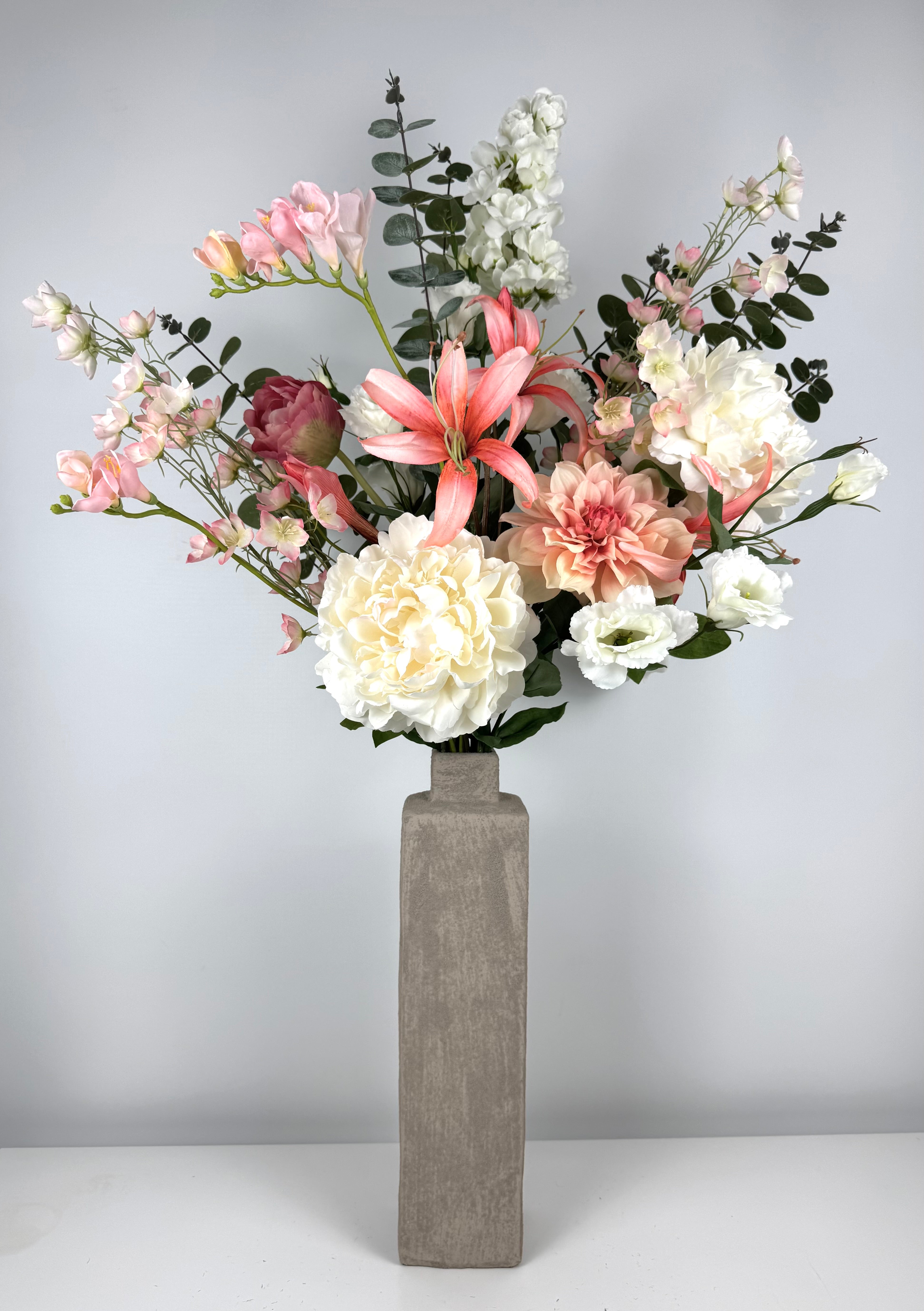 Choose between our Signature Bouquets (90–120 cm), full and refined arrangements designed to brighten any room, or our Grand Arrangements (130–170 cm), luxurious statement pieces ideal for spacious interiors, lobbies, or reception areas. Both are crafted with premium artificial flowers and styled with care.